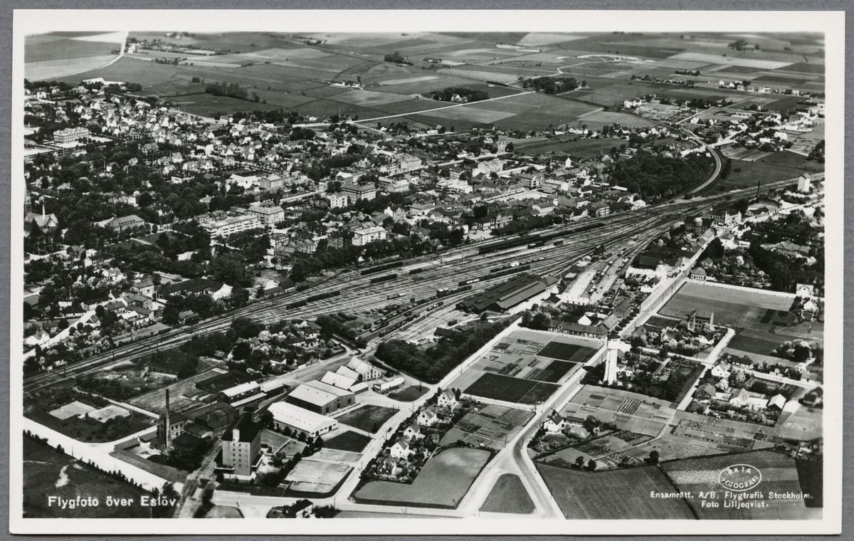 Flygfoto över Eslöv med järnvägsstationen och bangården i mitten.