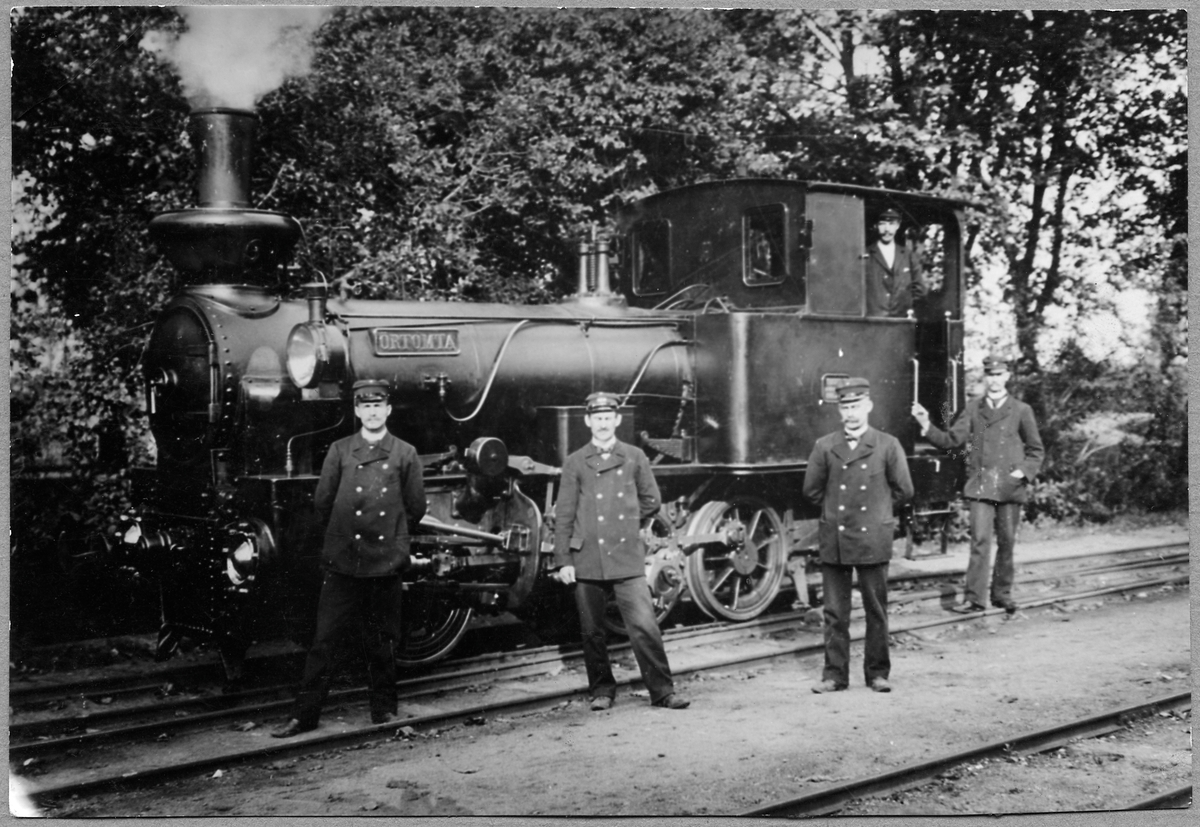 Norsholm Bersbo Järnväg, NBJ lok 9 "Örtomta" i Norsholm. Vid loket syns lokförare E. Edstrand och eldare Axel Häggström.