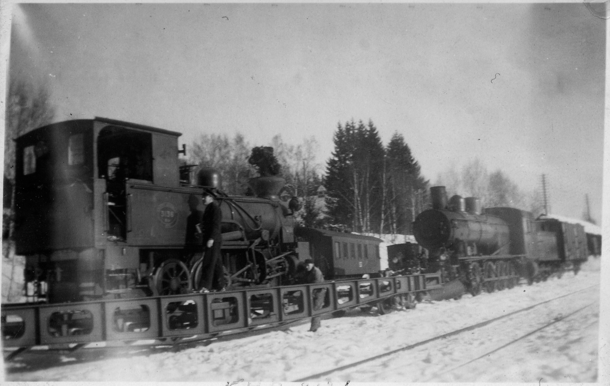 Titel: Norsholm - Västervik - Hultsfreds Järnvägar, NVHJ lok 4, Statens Järnvägar, SJ K5p 3136. Lok lastad på överföringsvagn för färd till Vislanda för skrotning efter 75 år i tjänst. Observera kransen på skorsten.