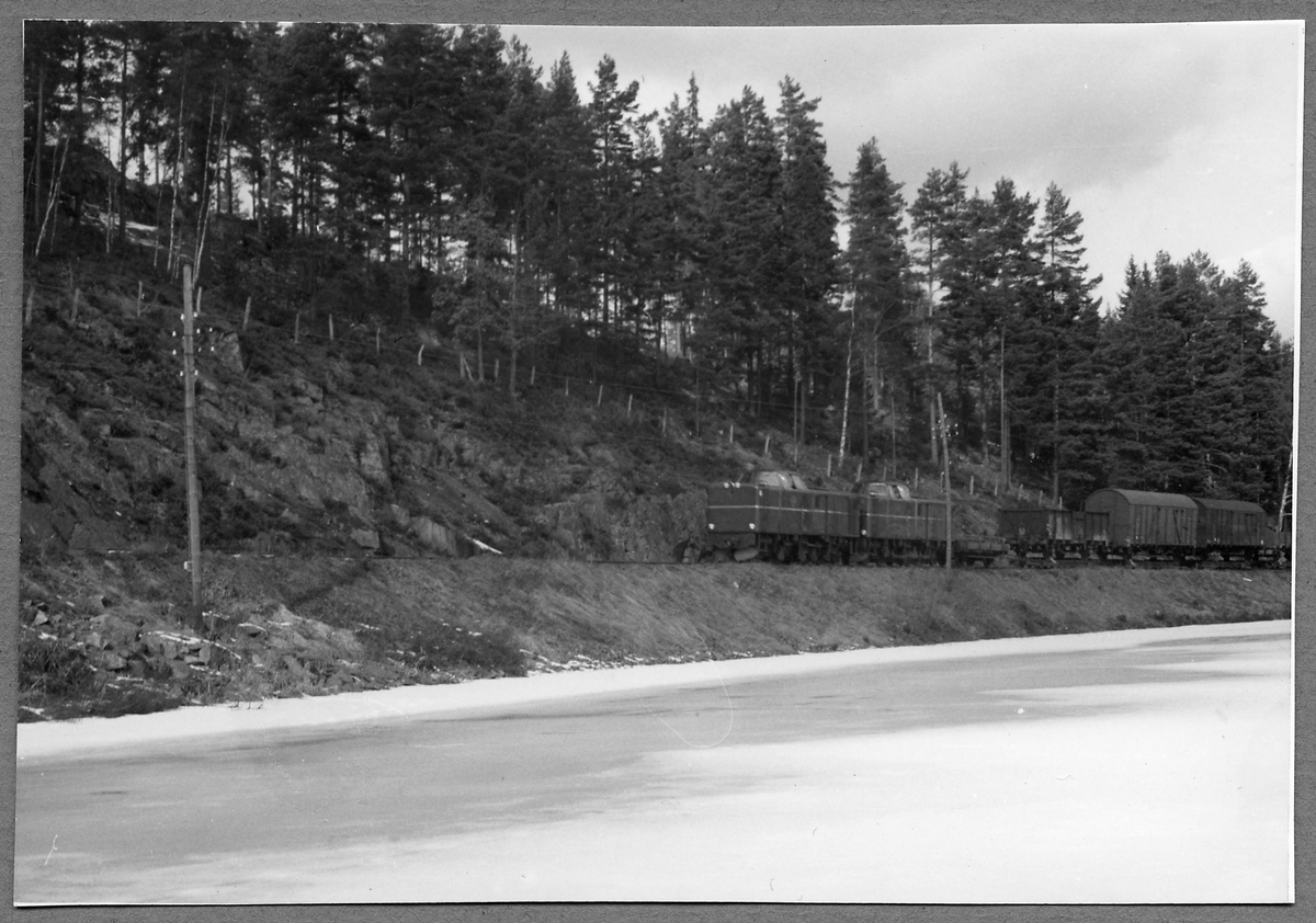 Två Tp Diesellok med vagnar på linjen mellan Hjorted och Totebo.