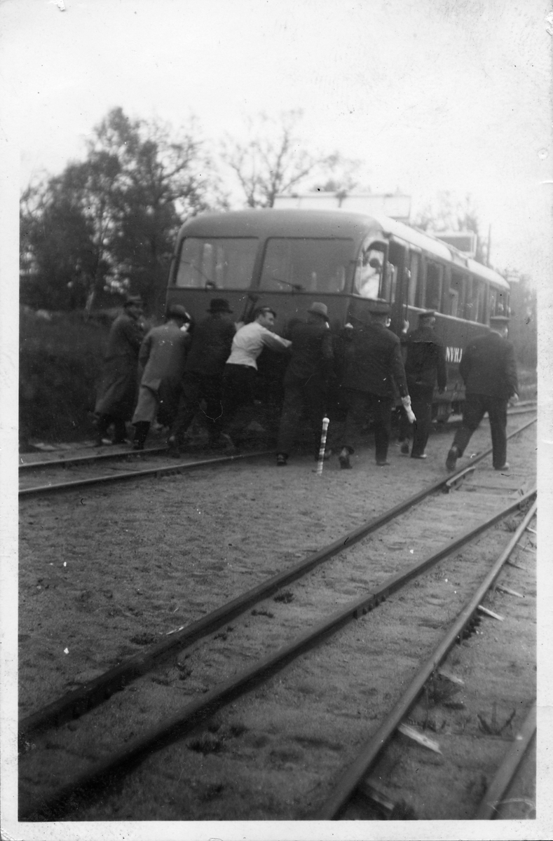 Rälsbuss Norsholm - Västervik - Hultsfreds Järnvägar, NVHJ Y 21 skjutes in av de resande till Fårhult station efter motorhaveri.