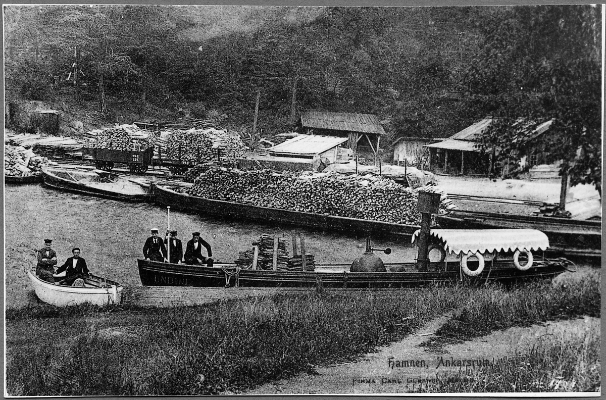 Ångbåten "Undine" i Ankarsrum hamn i samtrafik med järnvägen. Västervik - Åtvidaberg - Bersbo Järnväg, WÅBJ godsvagn 326 på hamnspåret bakom.
