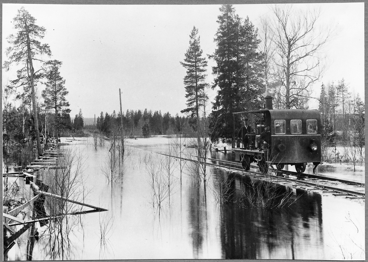 Mora Vänerns Järnväg, MVJ Ångdressin åker genom en översvämning i närheten av Vansbro.