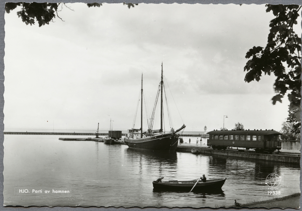 Parti av hamnen i Hjo, med fartyg och Statens Järnvägar, SJ personvagn.