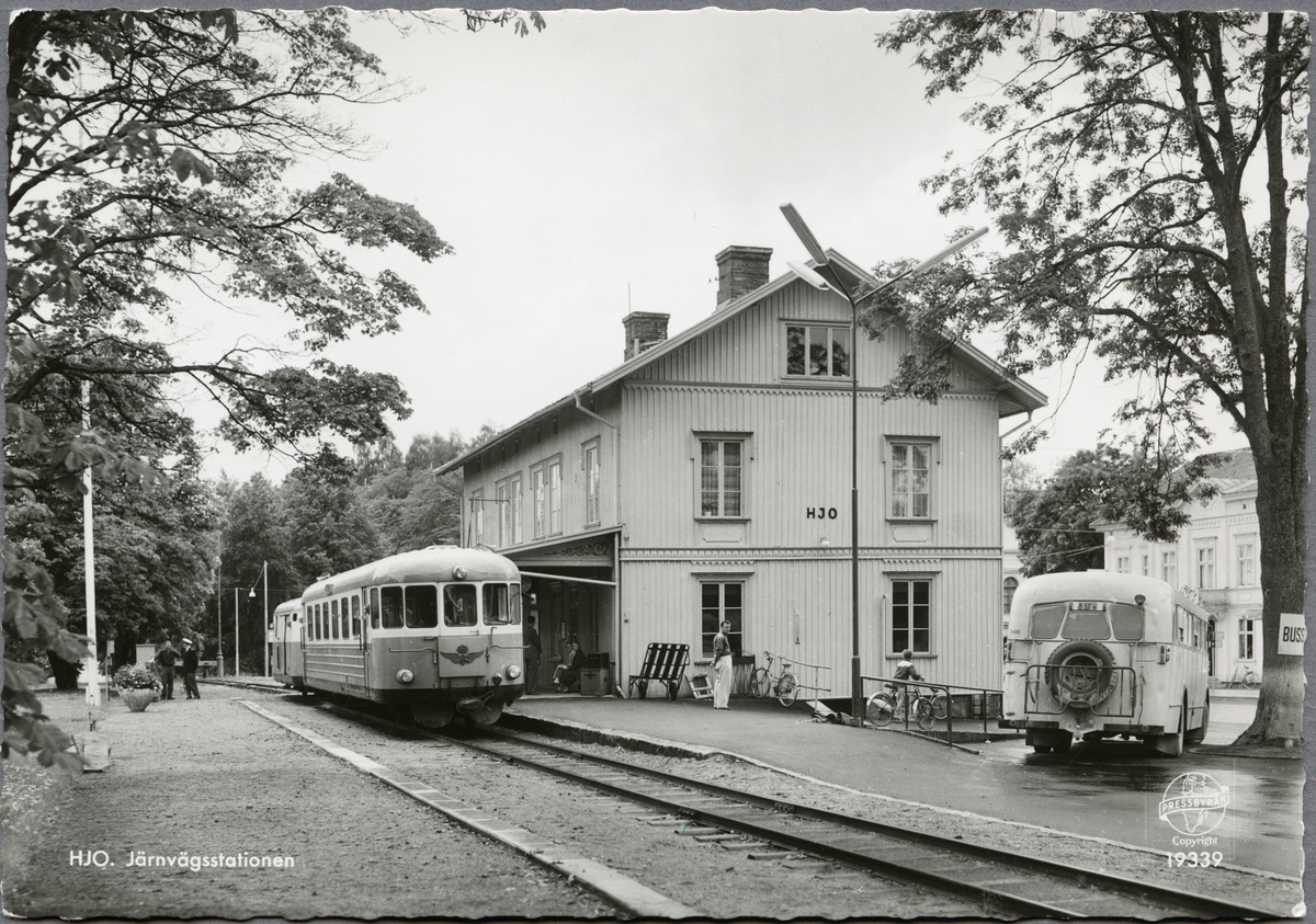 Järnvägsstationen i Hjo med rälsbuss och resande.