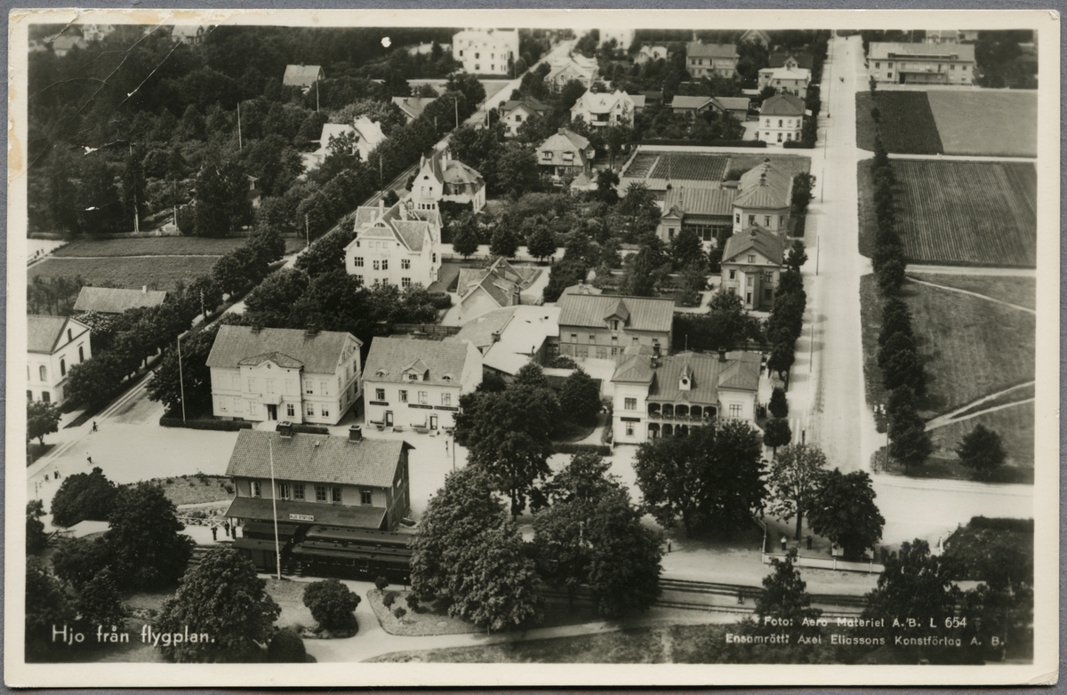 Flyfoto över Hjo med tågstation.