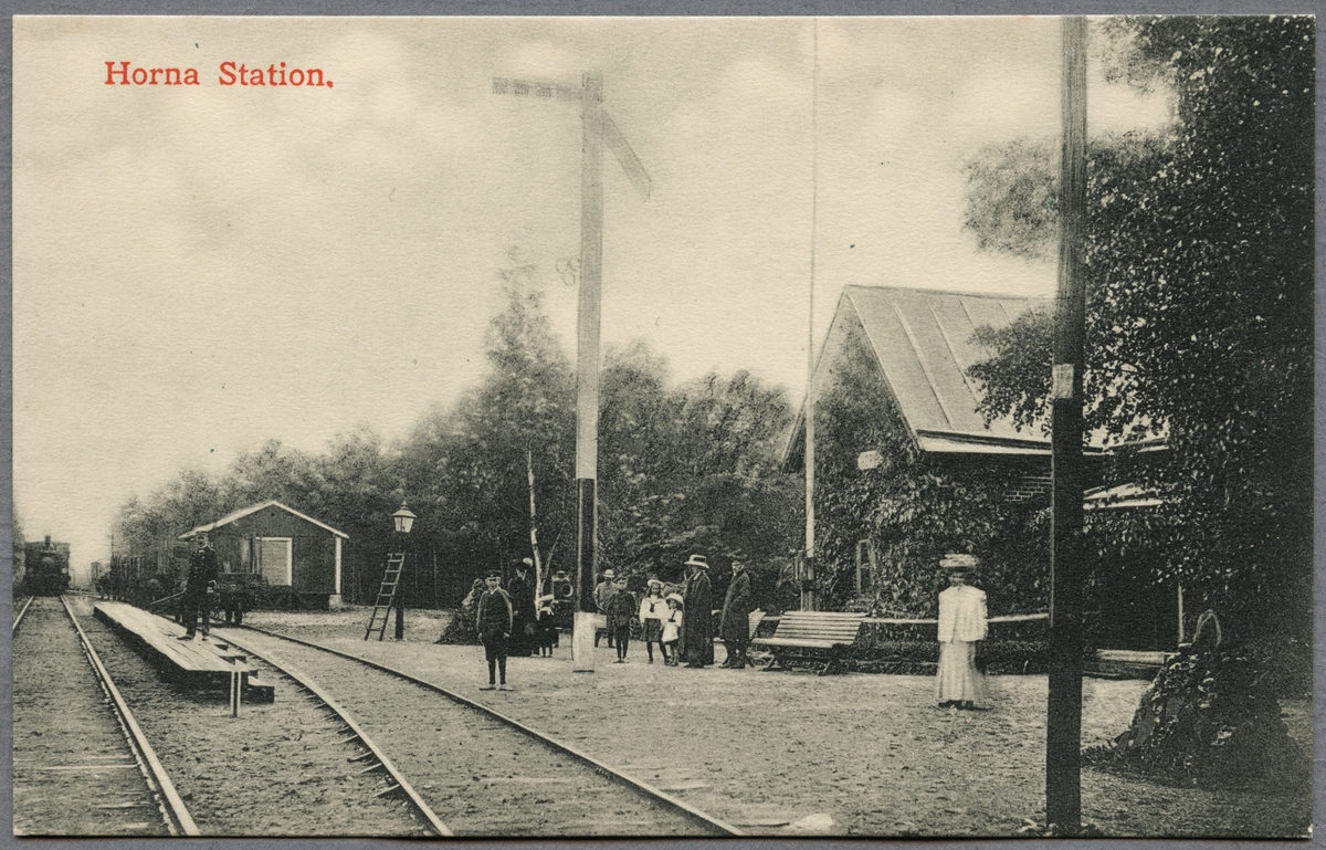 Horna tågstation med personal och resande.