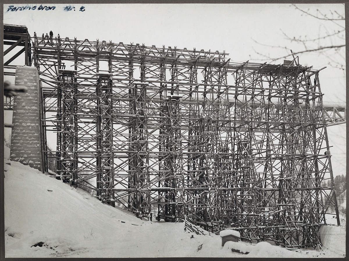 Brobygge jjärnvägsbron över Ångermanälven vid Forsmo. Äldre bro syns bakom.