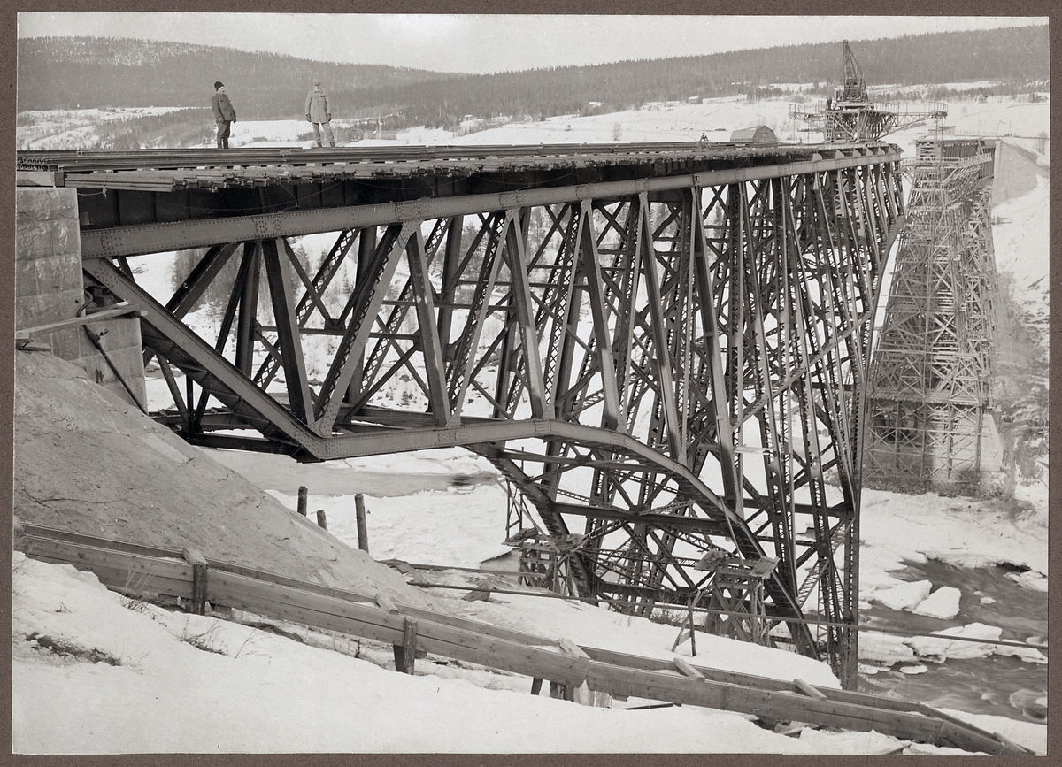 Brobygget av järnvägsbron över Ångermanälven vid Forsmo.
