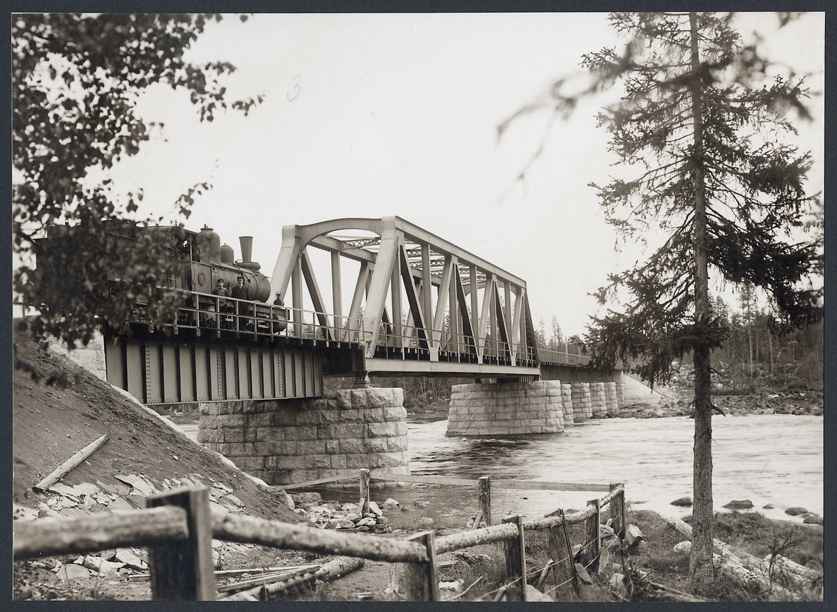 Järnvägsbro över Meseleforsen på linjen mellan Ulriksfors och Volgsjön. Personalen framför ångloket. Statens Järnvägar, SJ Kd 390.