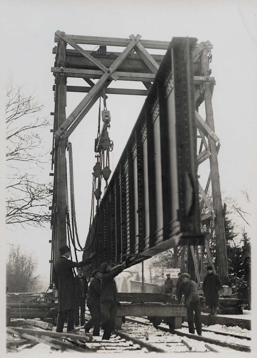 Brobalkar nedsänkta på trallor för transport till bygget av järnvägsbron över Ätran.