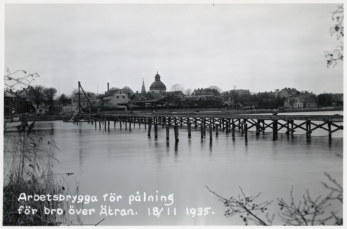 Arbetsbrygga för pålningsarbete för byggande av bro över Ätran. Falkenbergs gamla kyrka, S:t Laurentii, syns i bakgrunden.