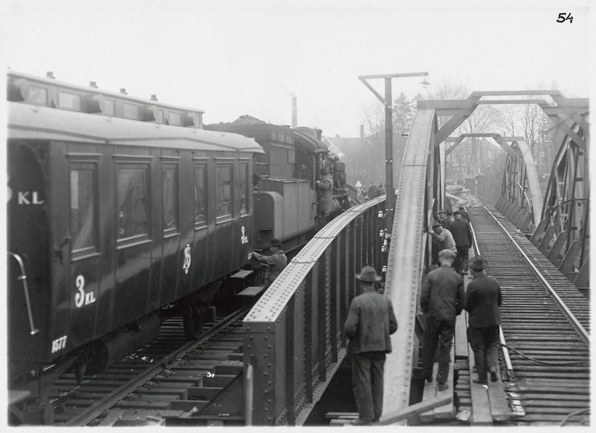 Byte av överbyggnaden på järnvägsbron över Nissan i Halmstad. Statens Järnvägar, SJ C3 1577.