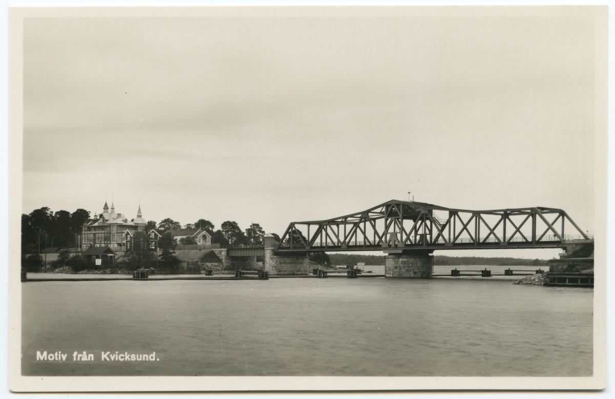 Bild över Kvicksund taget från söder mot Kvicksundsbron och Nyckelön där den norra delen av Kvicksund ligger, på linjen mellan Kvicksund och Nyckelön. Till vänster i bild syns hotellet i Kvicksund.
