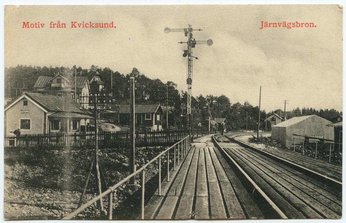 Bild tagen från Kvicksundsbron mot järnvägsstationen i Kvicksund med omnejd, på linjen mellan Kvicksund och Nyckelön. Stationen skymtar längst bak i bild.