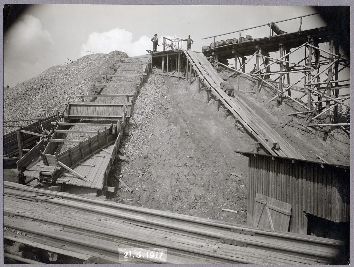 Detalj från blandningsstationen på västra stranden visande cementtransporten samt makadamupplaget på bankslänten med tipprännan för fin makadam.