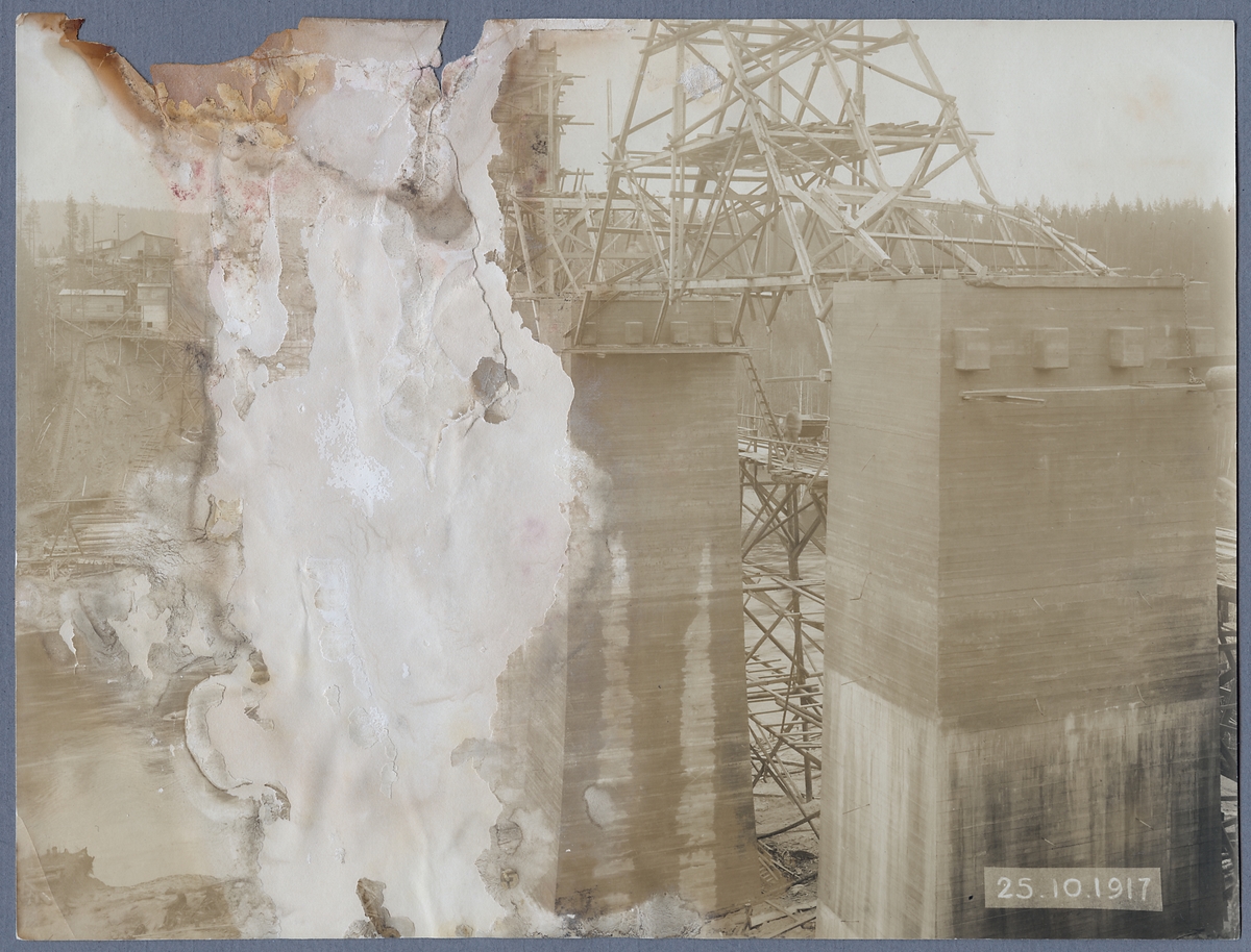 Bygge av järnvägsbro över Öreälv. Uppsättning av arbetsställningar för de mindre valvställningarna.