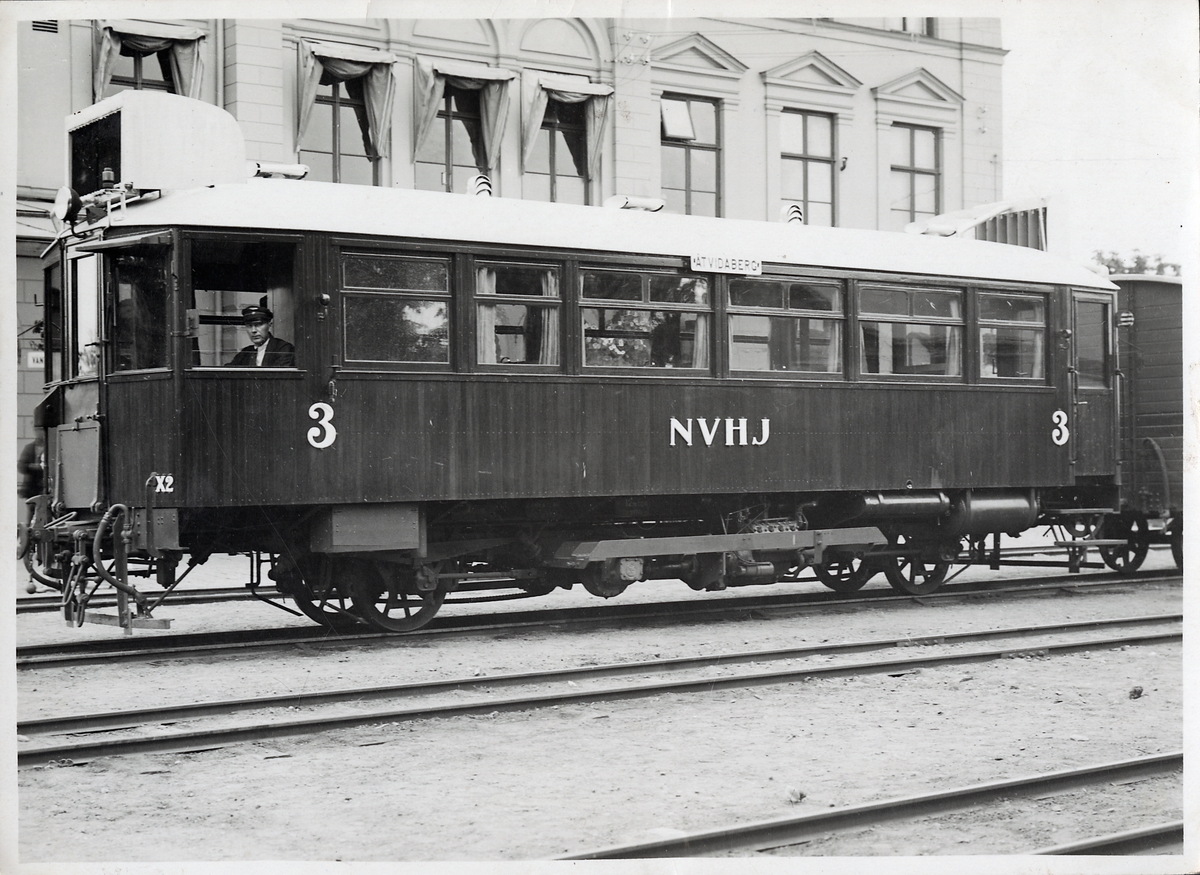 Rälsbuss Norsholm - Västervik - Hultsfreds Järnvägar, NVHJ motorvagn X2 på väg till Åtvidaberg står framför Västervik station.
