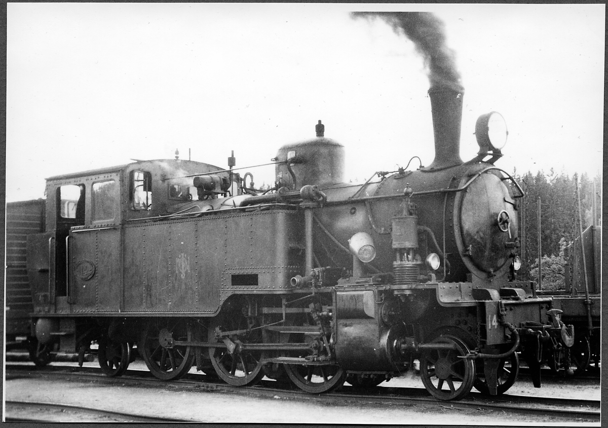 Ånglok, Norra Östergötlands Järnvägar, NÖJ lok 14, tillverkat av Nohab 1915 för spårvidd 891mm, skrotat i Vislanda 1960.