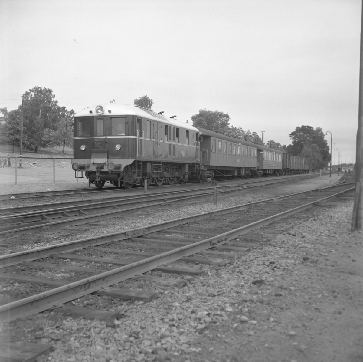Stockholm - Nynäs Järnväg, SNJ ÄF 10 med tåg bestående av SNJ B0 2 och B0 7 samt några godsvagnar..