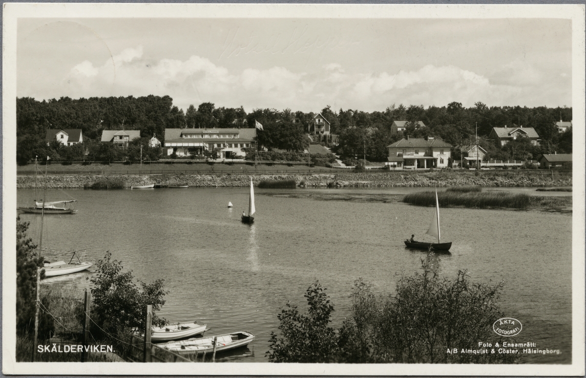 Sommarbild från Skälderviken med hotellet Hoppet i bakgrunden. Skåne - Hallands Järnväg, SHJ.
