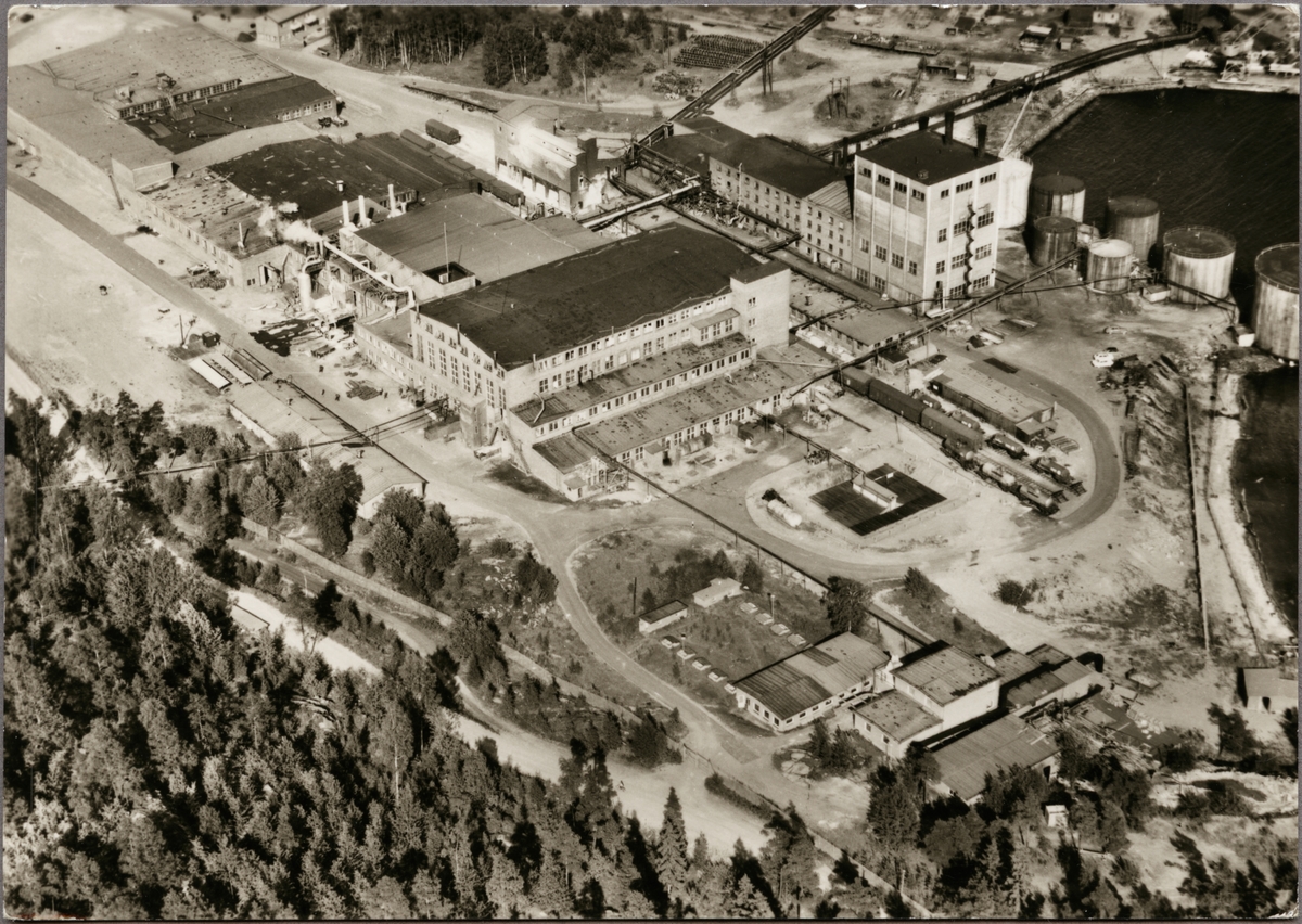 Flygfoto över Älvenäs Cellullfabrik, även kallat Svenska Rayon, strax söder om Vålberg.