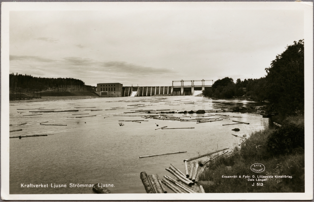 Ljusnan med timmer och vattenkraftverk i bakgrunden.