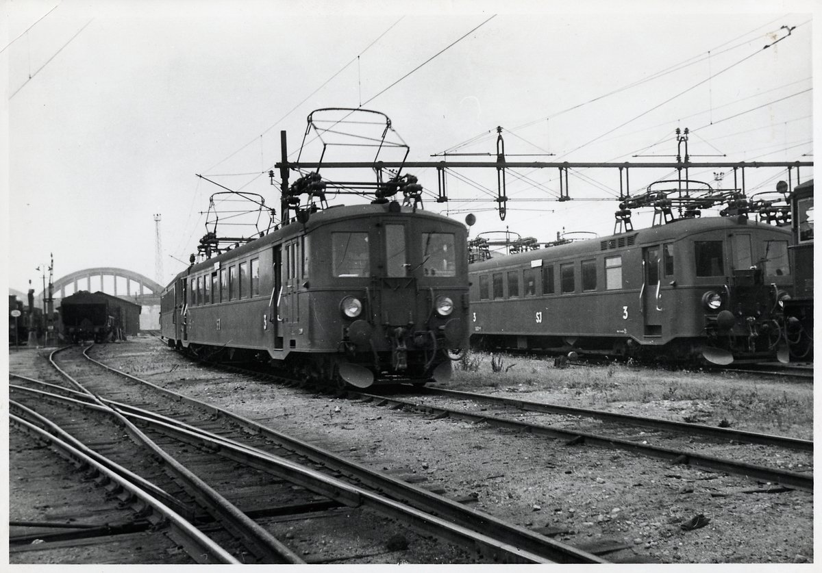 Motorvagn Statens järnvägar SJ Xoa-4, med tillkopplad mellanvagn och manövervagn. Trafikerade linjen Malmö-Lund. Här vid Malmö centralstations bangård.