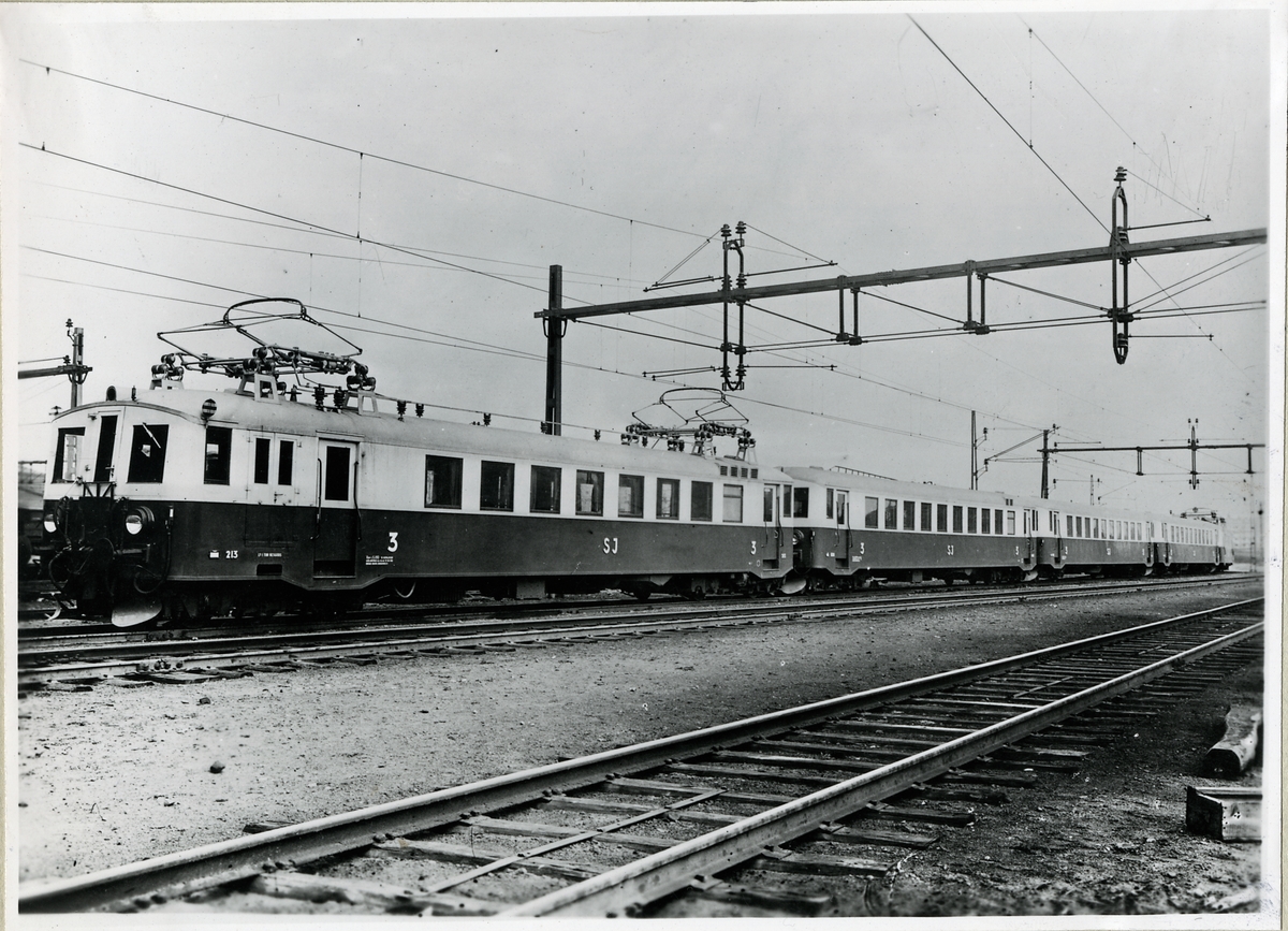 Motorvagn SJ Xoa4 213, med tillkopplade mellanvagnar och manövervagn.
