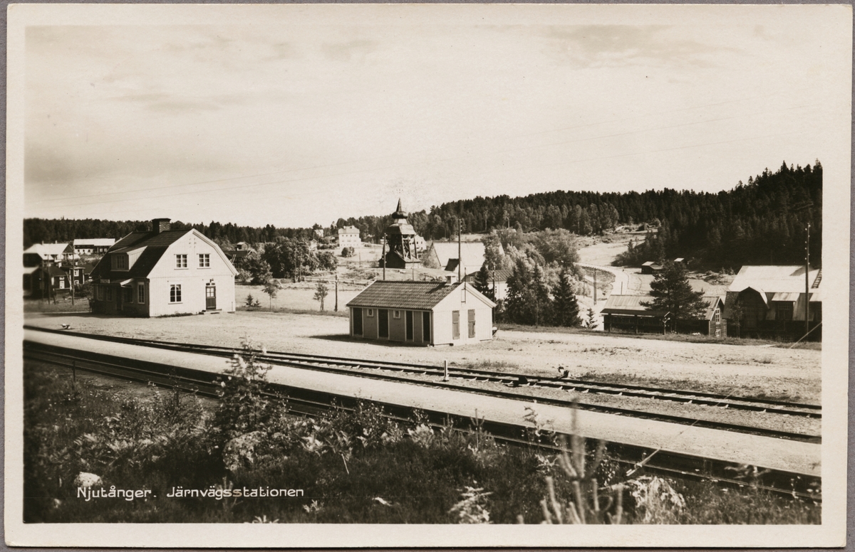 Stationsområde och del av bangård med kyrktorn i bakgrunden.