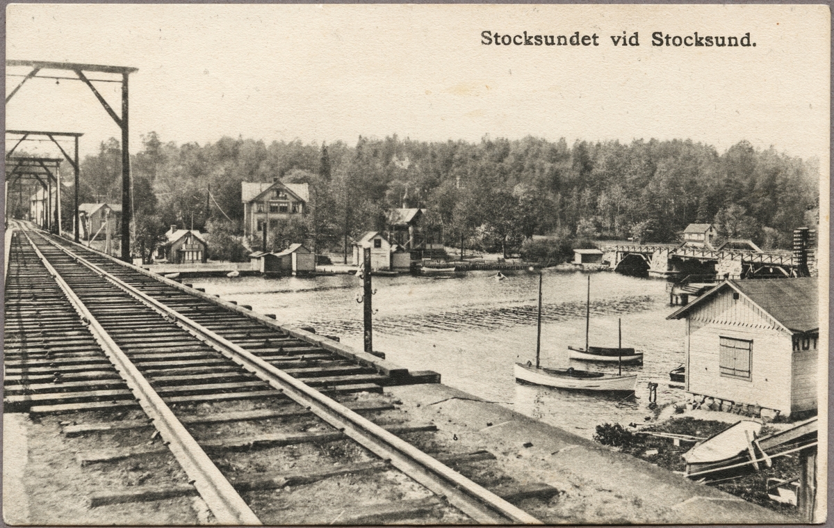 Vy på bebyggelse och broar vid Stocksundet mellan Stocksund och Ålkistan.