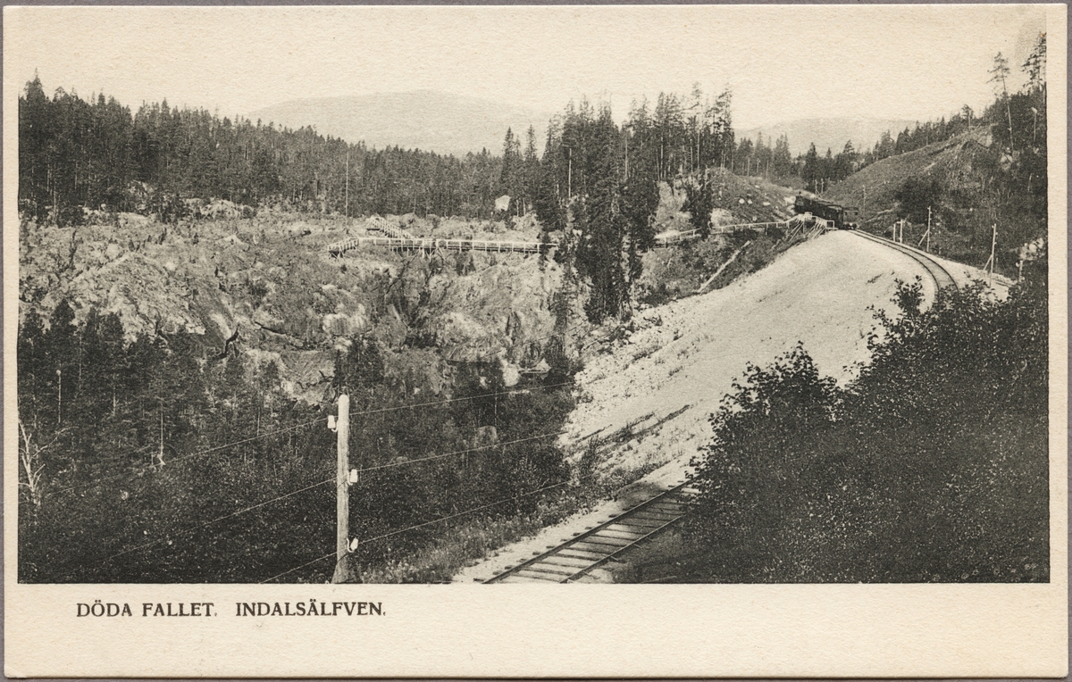 Järnvägen går förbi Döda Fallet på linjen mellan Ragunda och Bispgården.