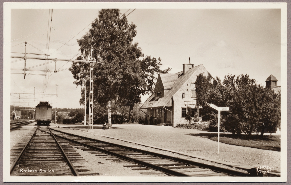 Stationsområde och elektriefierad bangård med vy på växel. och stationshus.