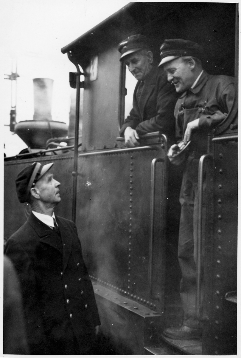 Personal samlad vid ångloket för Krylbo - Norbergs Järnvägs sista avgång. KNJ X2 2 "Bjurfors".
