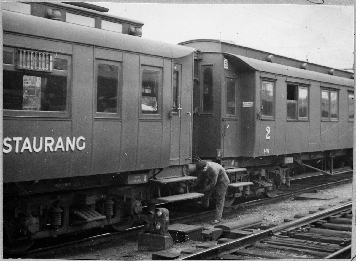 Vagnarna är Statens Järnvägar, SJ R01 3029 eller 3030 före detta. Uppsala - Gävle Järnväg, UGJ och SJ B04 1414. RESTAURANT ändrades till RESTAURANG 1941 och G:et i märkningen RESTAURANG fick från 1952 en hake. Gavelstegarna tog ned från och med 1943.