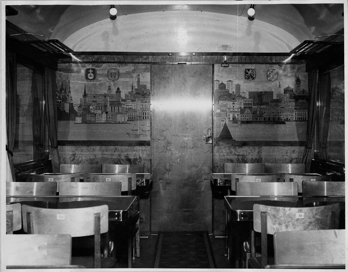 Statens Järnvägar, SJ R03 3747, restaurangvagn. Intarsiavägg med motiv från Stockholm och Göteborg, skapad av Ewald Dahlskog.