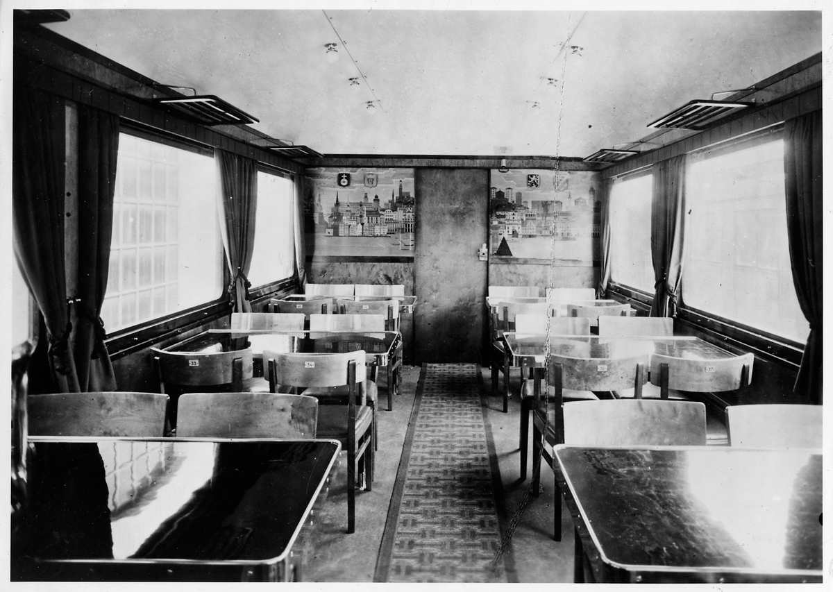 Statens Järnvägar, SJ R03 3747, restaurangvagn. Intarsiavägg med motiv från Stockholm och Göteborg, skapad av Ewald Dahlskog.
