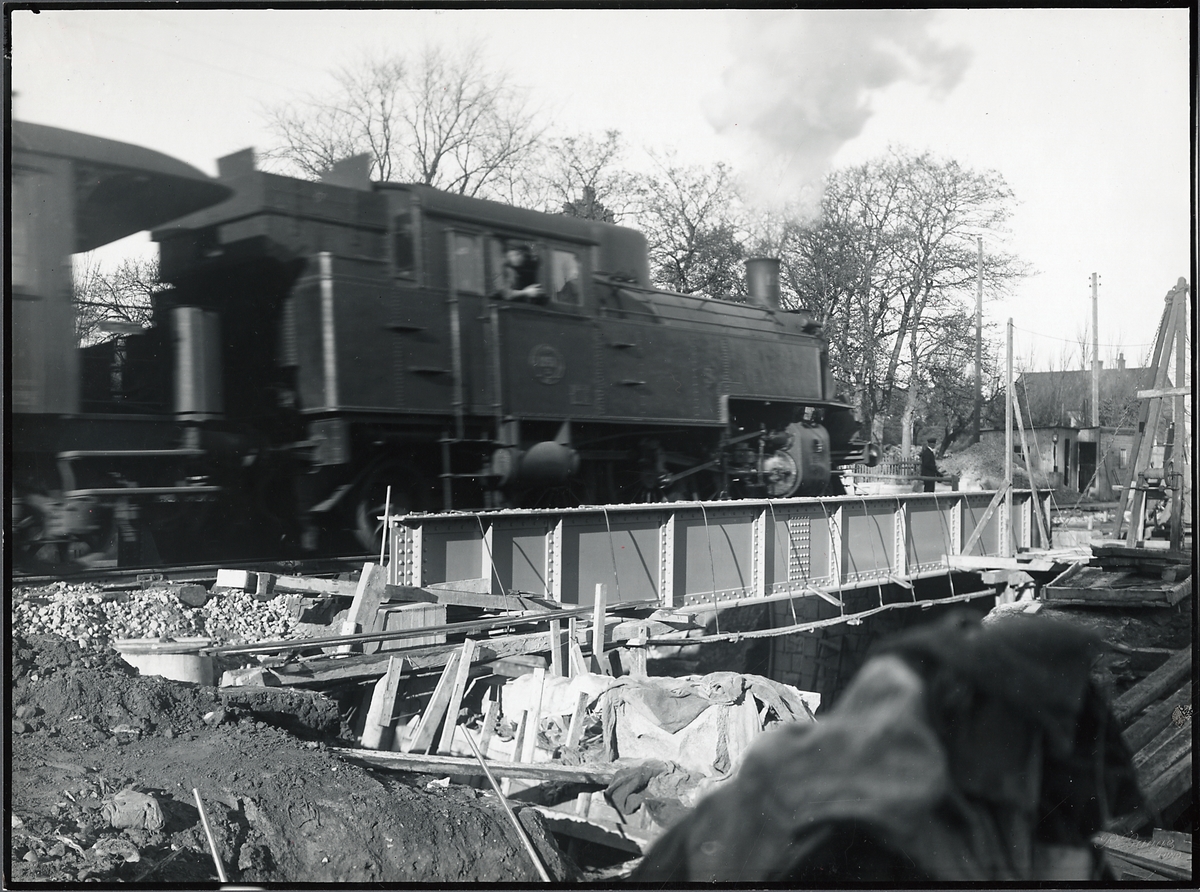 Byggnation av vägport över Trollebergsvägen i Lund. Första tåget passerar bron på uppspåret.