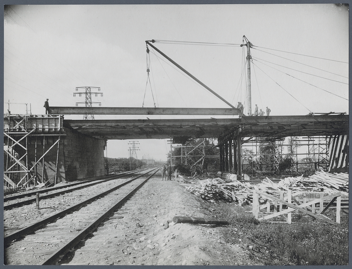 Byggnation av Sjölundaviadukten, uppläggning av balk i spann 1.