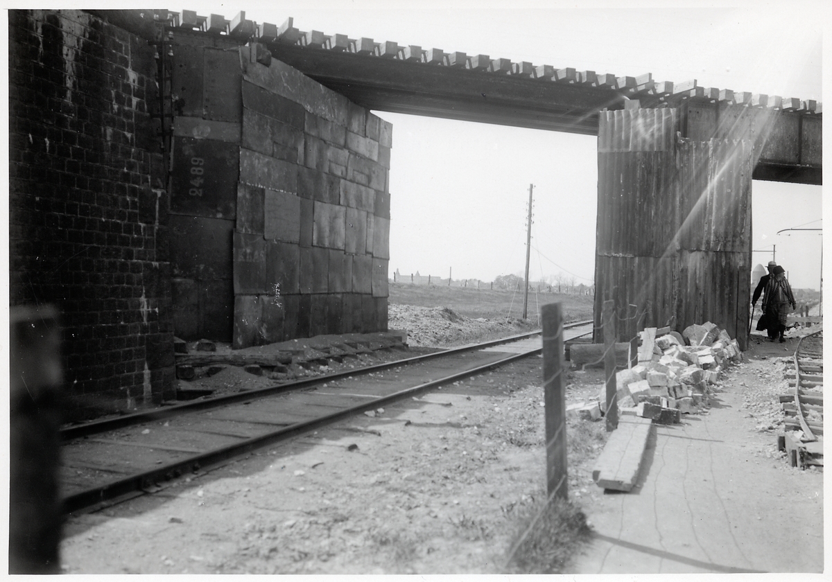 Ombyggnad av viadukten över Malmö-Ystads Järnväg, på sträckan mellan Malmö och Trelleborg. Södra landfästet i gamla bron samt provisoriska viaduktens pallningar.