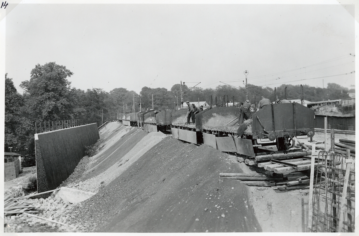 Uppförande av stödmur för järnvägsbanken vid byggnationen av ny järnvägsviadukt över Norrtullsgatan. Belägen ca 100 m öster om östra landfästet i nya vidaukten. Fyllningen bakom muren pågår.