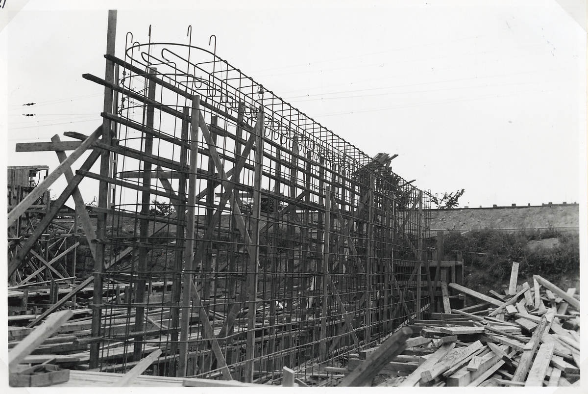 Byggnationen av ny järnvägsviadukt över Norrtullsgatan. Armering av fundament.