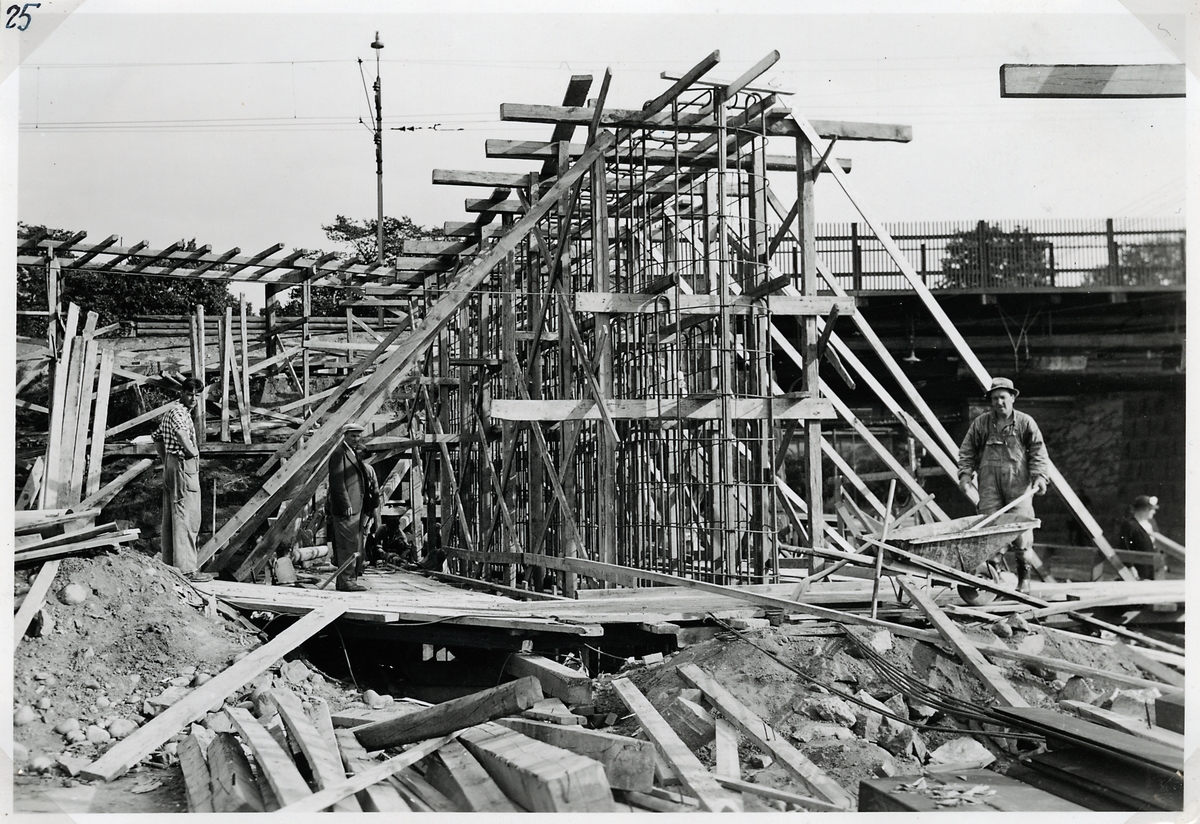 Byggnationen av ny järnvägsviadukt över Norrtullsgatan. Gjutning av bottenplatta för fundament.