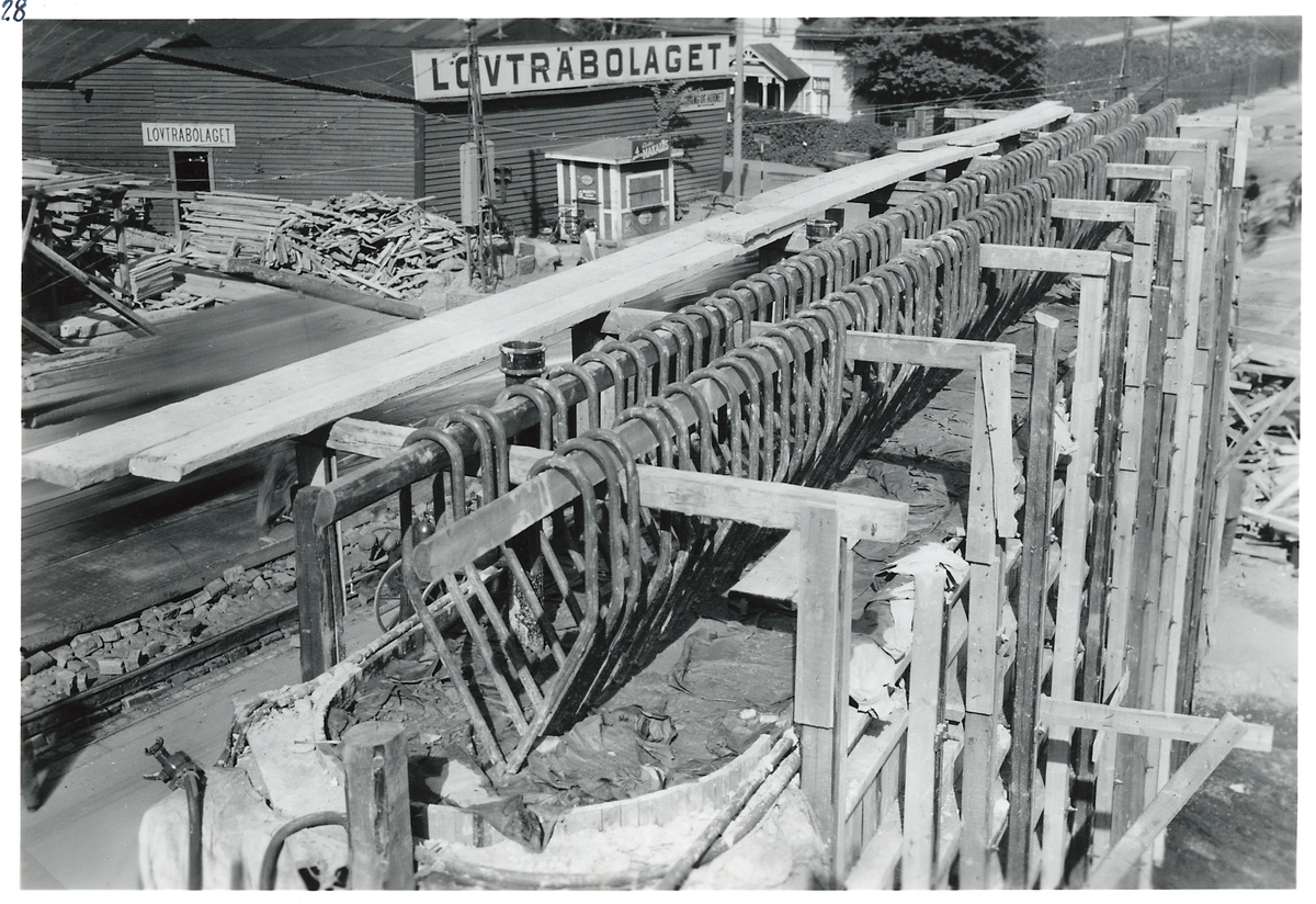 Byggnationen av ny järnvägsviadukt över Norrtullsgatan. Gjutning av fundament.