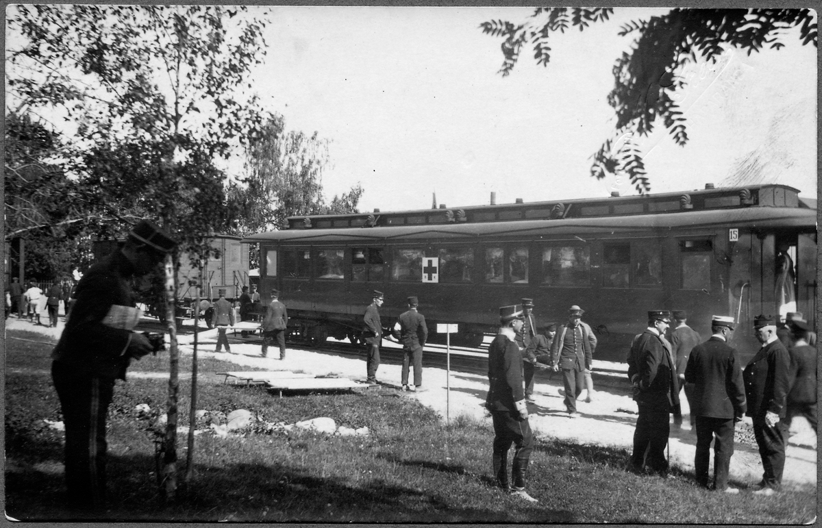 Första tåget Ryssland - Tyskland med krigsinvalider från Haparanda. Vagnen är Statens Järnvägar, SJ C05m 1911. En av de vagnar som gick fyllda med bårar. TT.