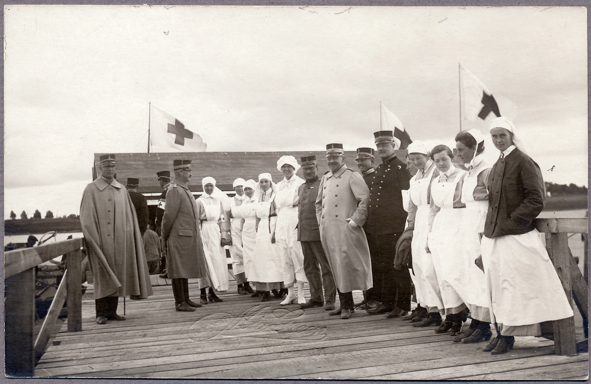 Officerare och sjukvårdspersonal på Haparanda skeppsbro under Första världskriget.