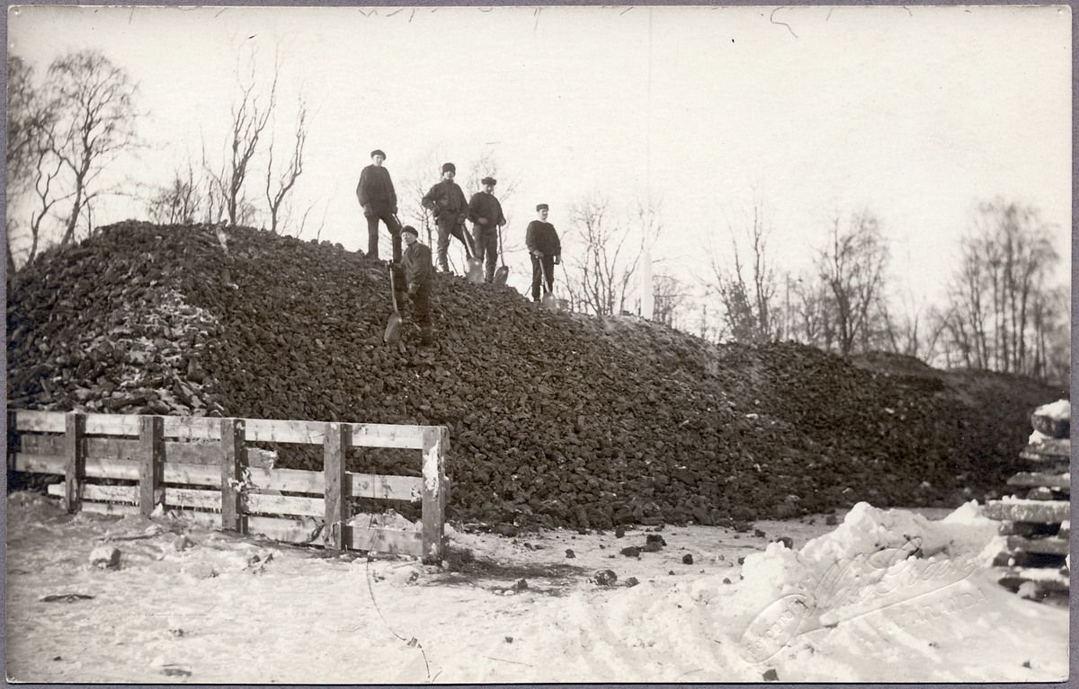 Arbetare uppställda på Statens Järnvägars stenkolsupplag i Haparanda under Första Världskriget.
