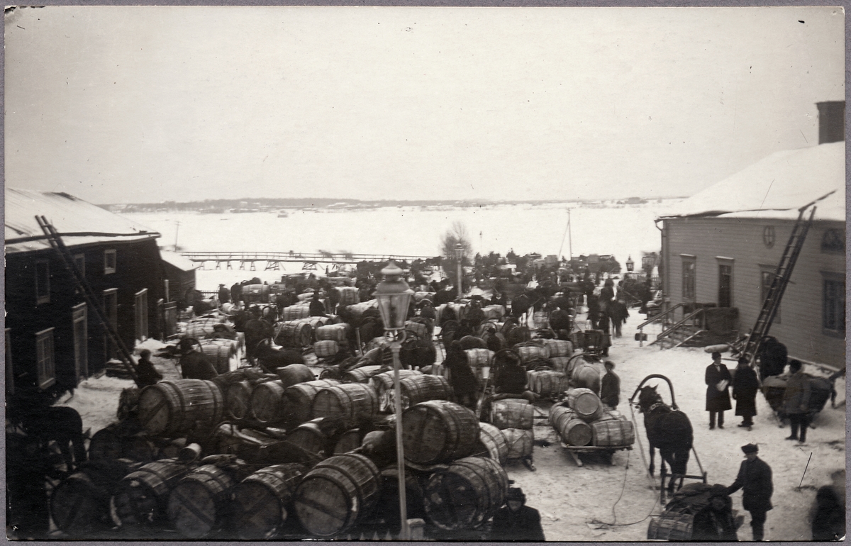 Godsupplag vid Tullgården i Haparanda under Första världskriget.
