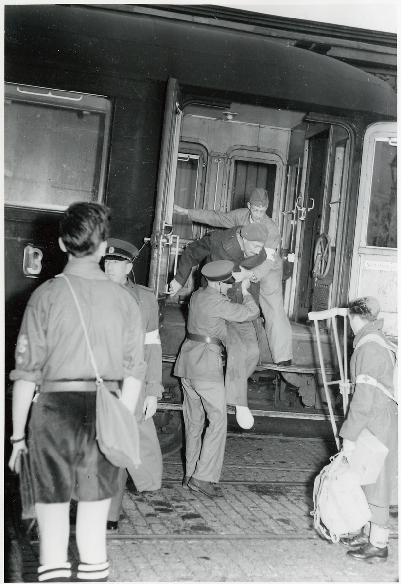 Allierade krigsfångar lämnar tyska lasarettståget i Göteborg.