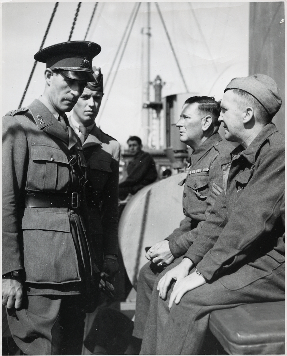 På bilden ses major, tillika byråchef vid järnvägsstyrelsens militärbyrå, Carl von Horn, i samspråk med brittiska krigsfångar ombord på S/S Drottning Victoria. Han erhöll 1958 en hög tjänst inom Förenta Nationerna.